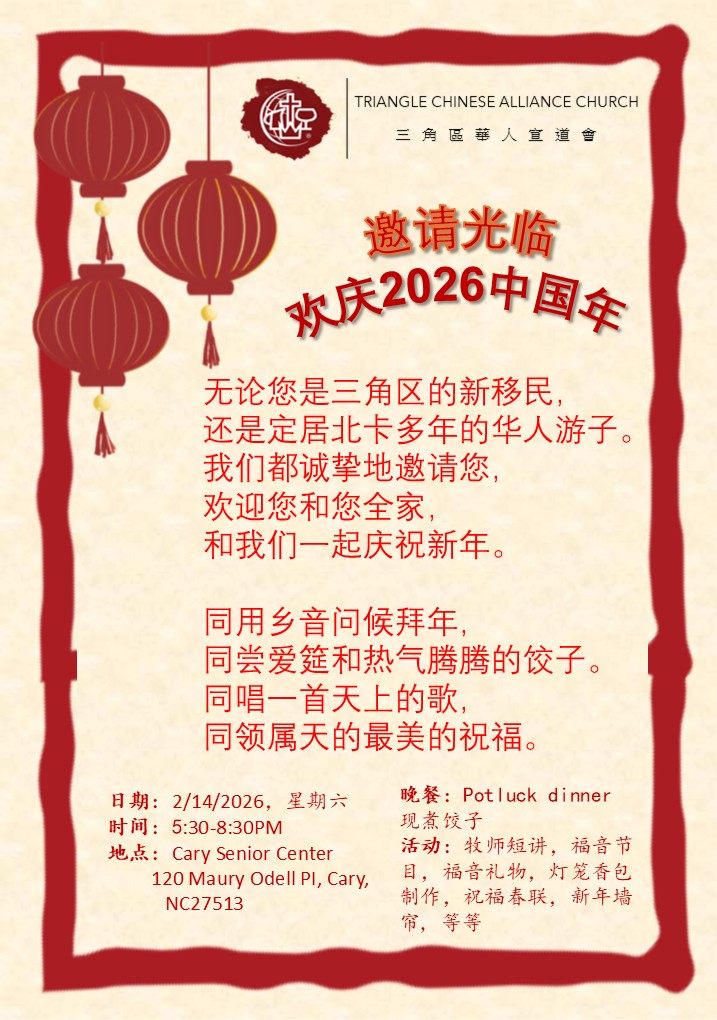 2026-02-14 17:30 2026-02-14 20:30 Europe/London 欢庆2026中国年 120 Maury Odell Pl, Cary NC 27513
