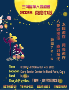 10/4 星期六6:00-8:30PM, 在Cary Senior Center. 我们教会将举办一个中秋福音外展活动。届时欢迎邀请你的家人,朋友,邻居和同事享受传统中式美食,共度中秋佳节。请预留时间,并关注群里的接龙报名和海报。